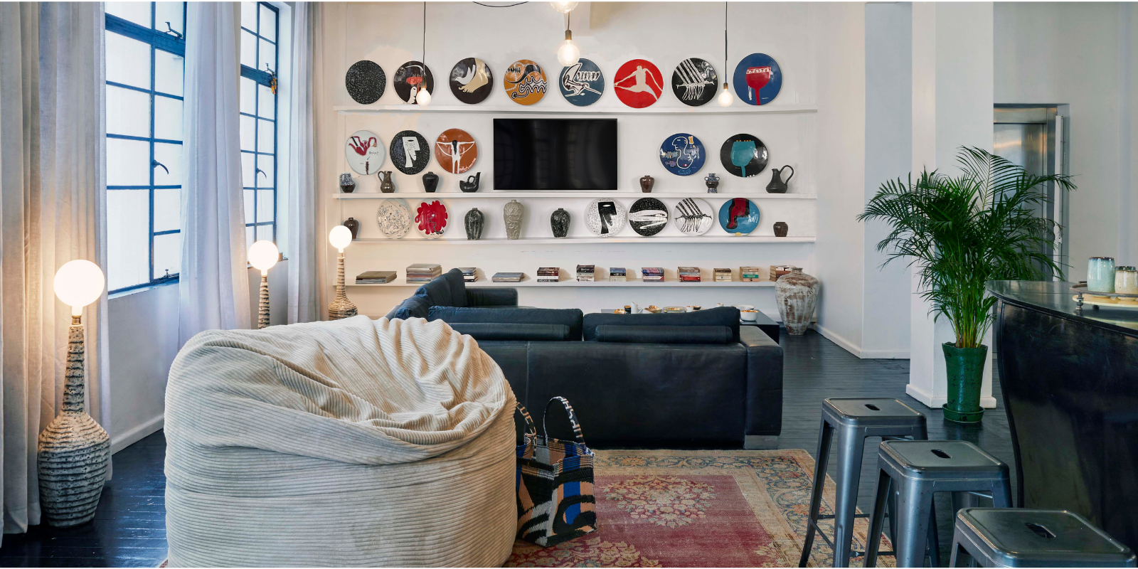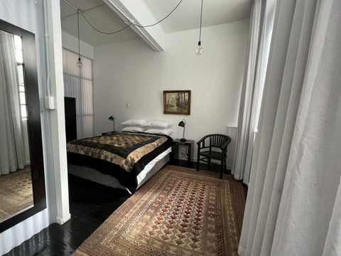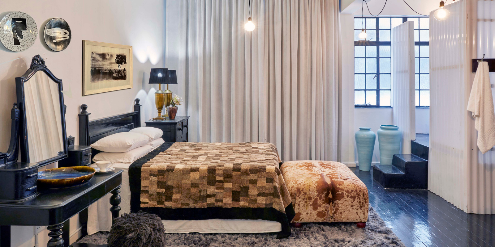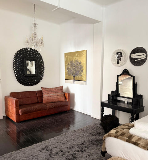 This Art-Centric two-bedroom luxury city apartment, lovingly curated by Mervyn Gers, features masses of space and light, striking decor, and a sensational selection of the ceramicist’s creations. High ceilings, wooden floors, an open-plan living area, and comfortable bedrooms make the apartment a beautiful place to work, socialise, and unwind.
