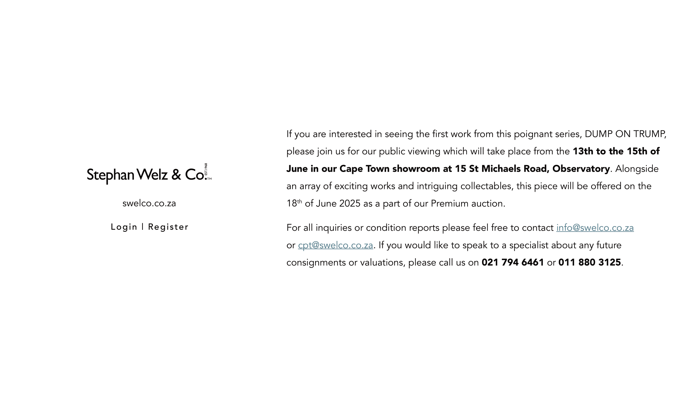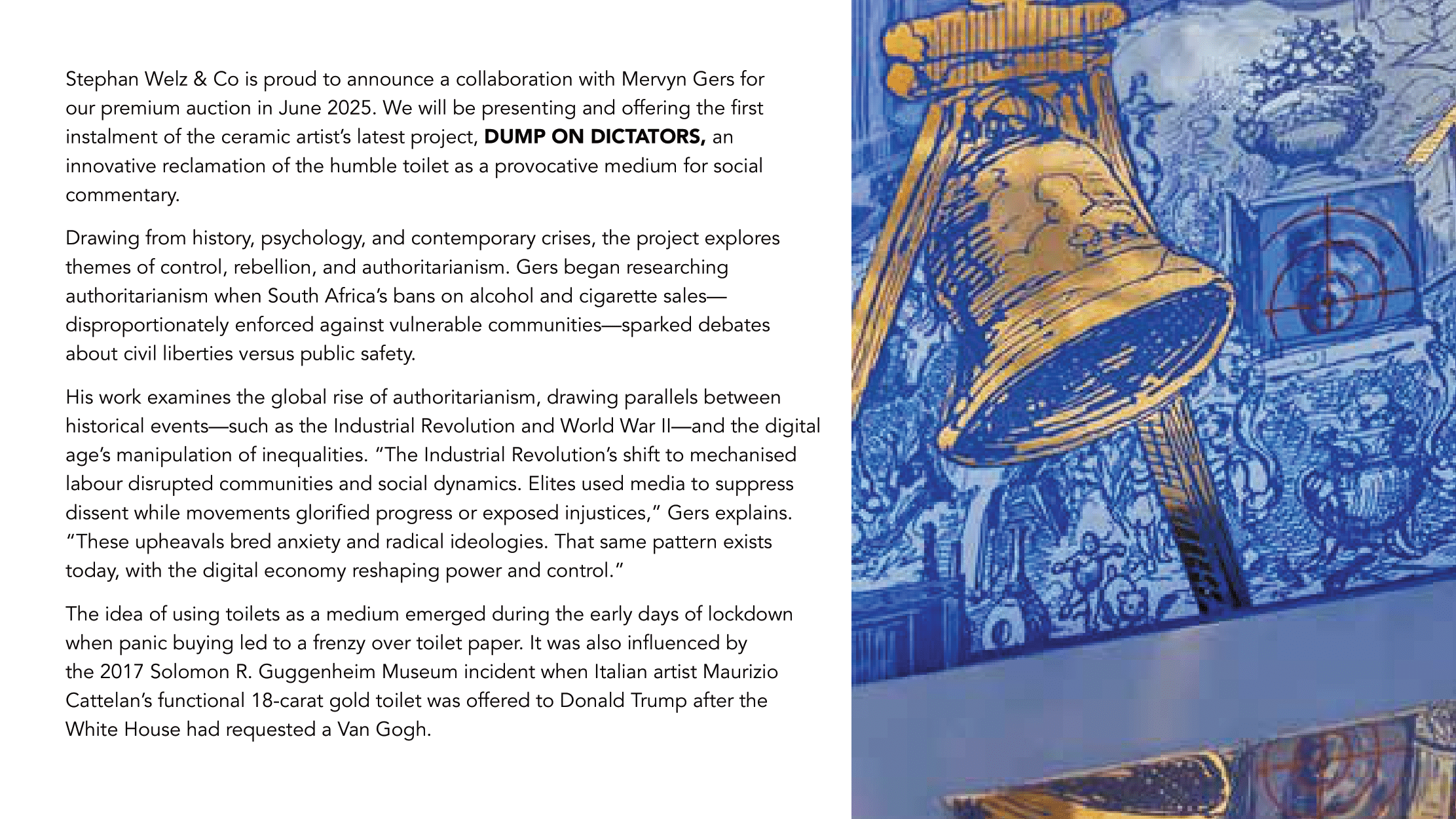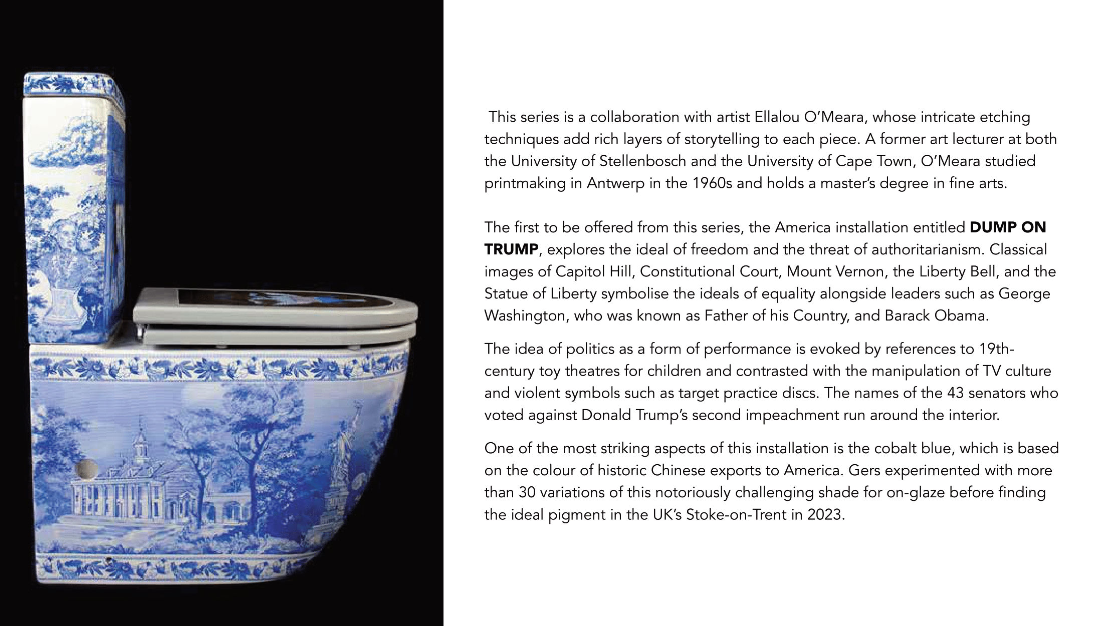 The first DUMP ON DICTATORS toilet in Mervyn Gers’s series—featuring themes from India, Russia, China, Turkey, and more—depicts Donald Trump and will be auctioned online by Stephan Welz & Co. on Wednesday, 18 June 2025.