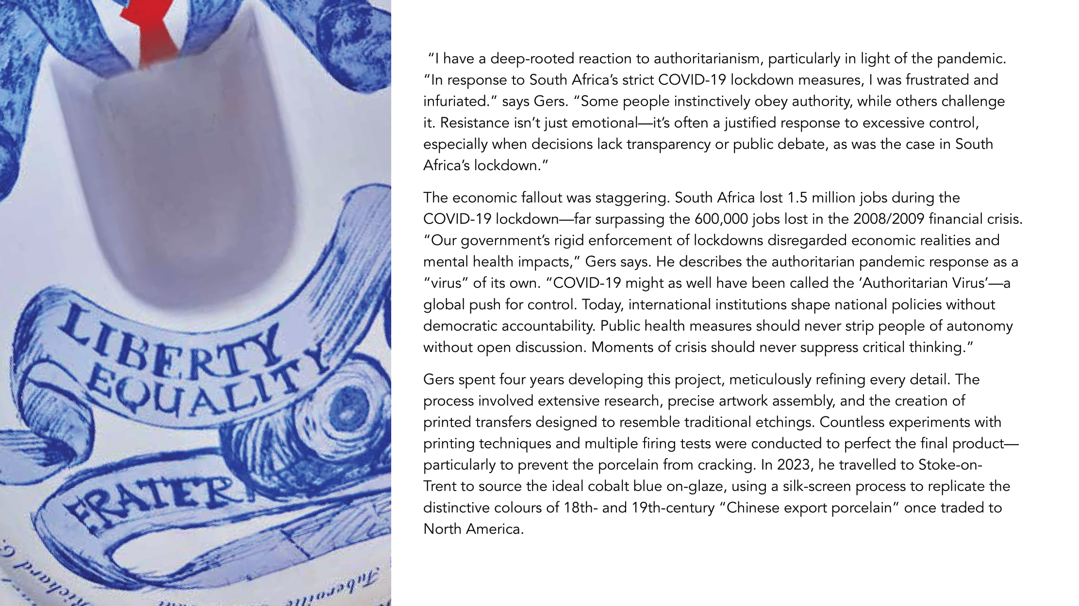 A series of six installation pieces all of which combine the mundane object ofthetoilet with fine art and traditional silkscreens, intricate ceramic processes, and satire to comment on the interaction between the personal and the political and the threat of authoritarianism. The result of four years of ongoing research, experimentation and collaboration, the toilets are simultaneously expertly crafted, aesthetically finessed, and functional. The series will be released individually, with each piece focusing on a different region of the world and all featuring a startling mix of visual beauty and provocative, thought-provoking statements.